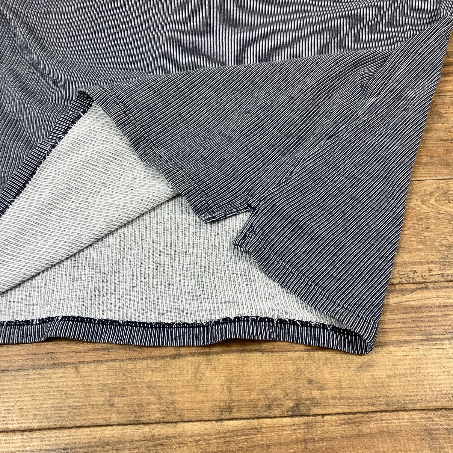明らかにTシャツの生地よりしっかりとしており、ピンストライプタイプの細かなストライプがワーク色な雰囲気です。